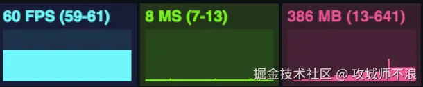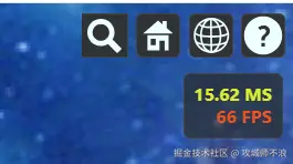 stats.js,用于实时监测Web端的性能指标,包括帧率,渲染一帧所需的毫秒数以及占用的内存