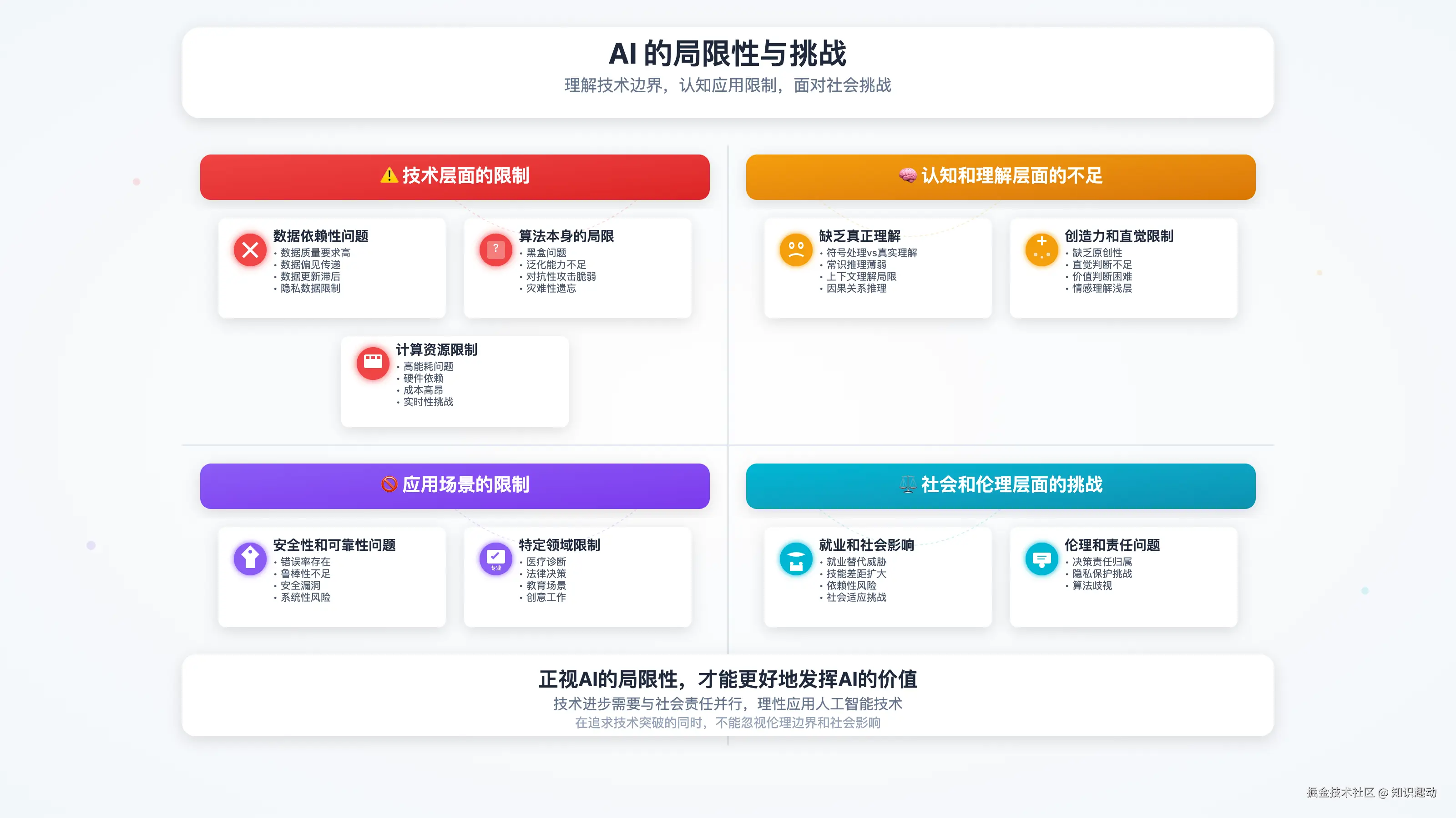 - 数据依赖:就像一个只能通过教科书学习的学生,如果教科书内容有偏差或不完整,学生的认知也会出现偏差。AI 完全依赖训练数据,数据质量直接影响 AI 的表现。