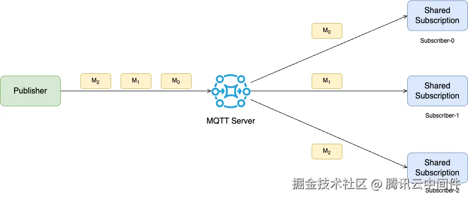 MQTT 5.0 协议规范了共享订阅功能,消息可以在相同 ShareName 内的多个订阅客户端之间负载均衡消费,为高吞吐的服务端应用提供了解决方案。