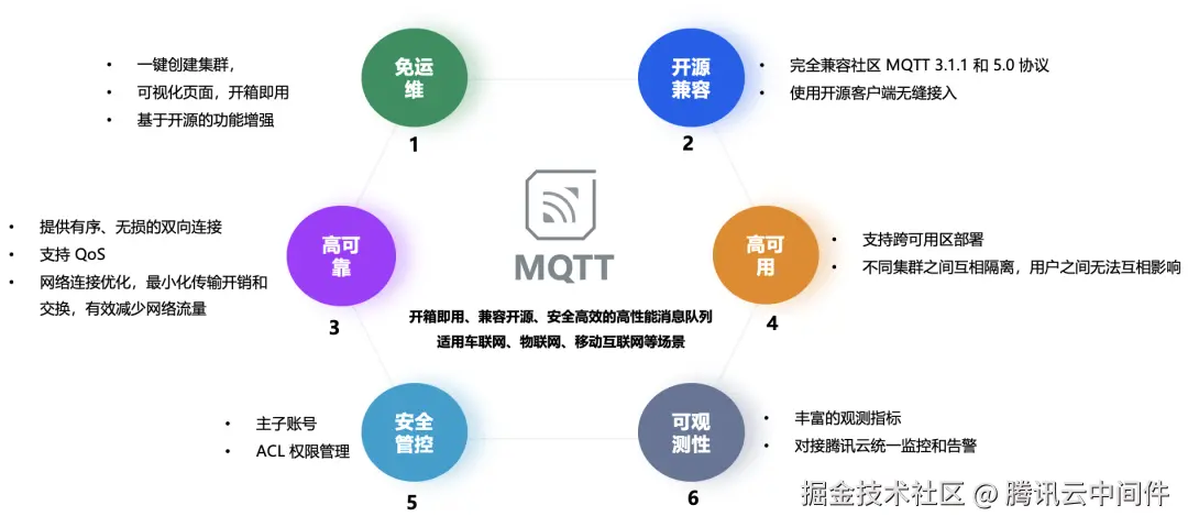 腾讯云 TDMQ MQTT 版是一款分布式高可用的消息队列服务,通过 “发布/订阅” 模式构建了极其轻量化的消息传输协议。TDMQ MQTT 版兼容标准的 MQTT 协议,支持开源社区和业内主流 MQTT 客户端零改造接入,并在稳定性、低延迟、高性能、可视化和持久化等特性上做了加强,最高支持百万客户端同时在线。