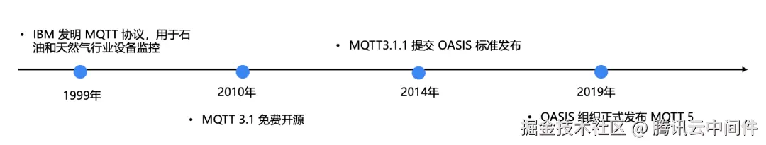 MQTT 是一种轻量级的物联网协议,大幅度降低了网络带宽和设备资源的消耗需求,并支持可靠的数据传输,因此 MQTT 已成为 IoT 领域最广泛应用的协议和事实标准。让我们简单回顾下这一协议的演进历程: