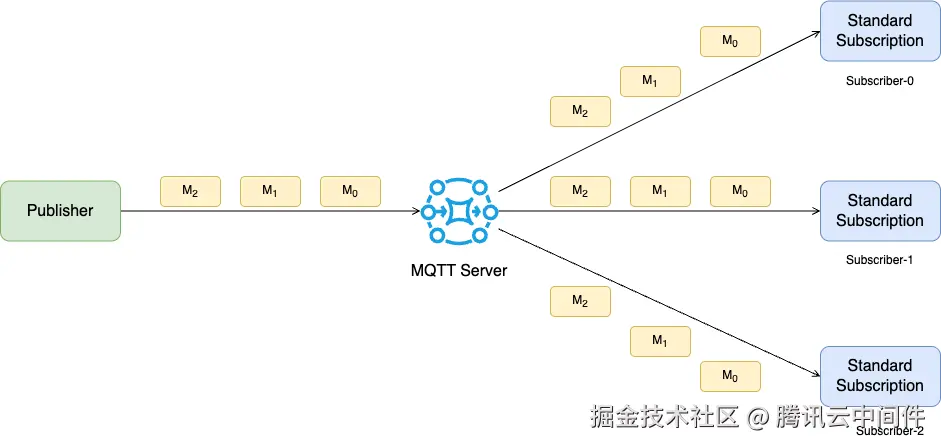 标准的订阅模式是扇出模型(fan-out):当多个客户端设备的消费者订阅同一主题时,每条消息会被转发到所有消费者,每个消费者都需要处理消息。