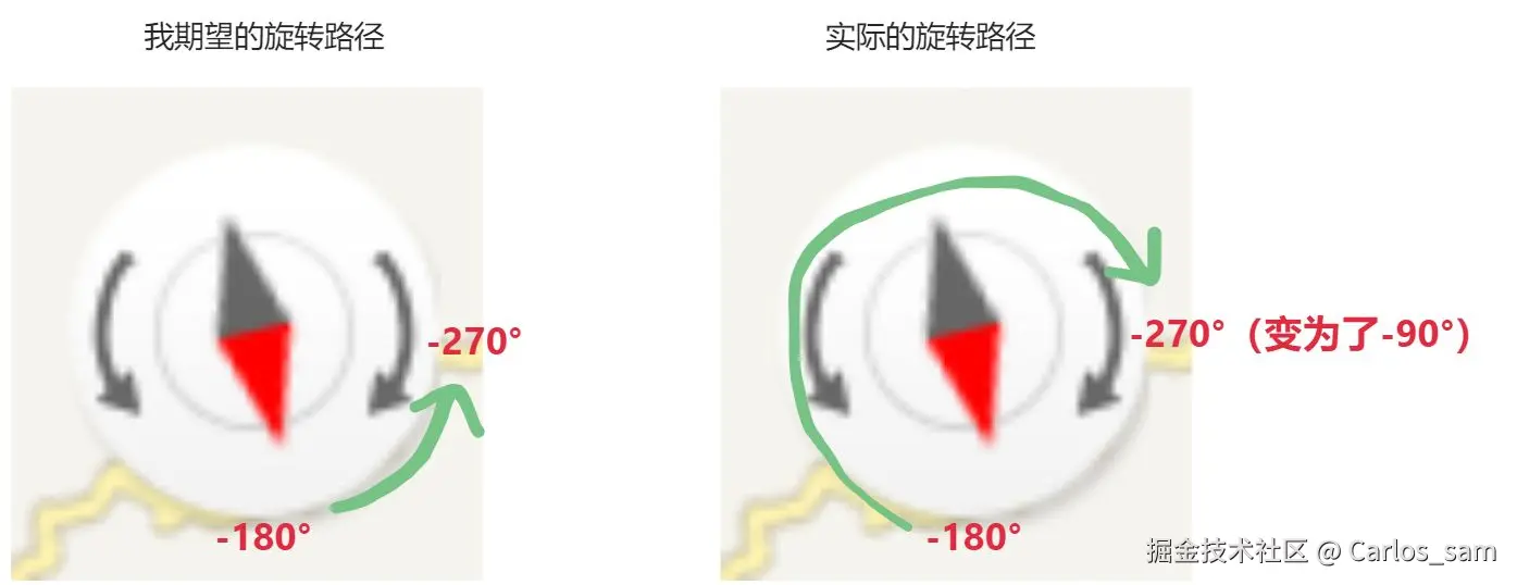 至于“最短路径归零”的问题,它实际上是符合css旋转的规则的,只是不符合我的需求,我也需要进行一些处理打破css旋转的默认规则。