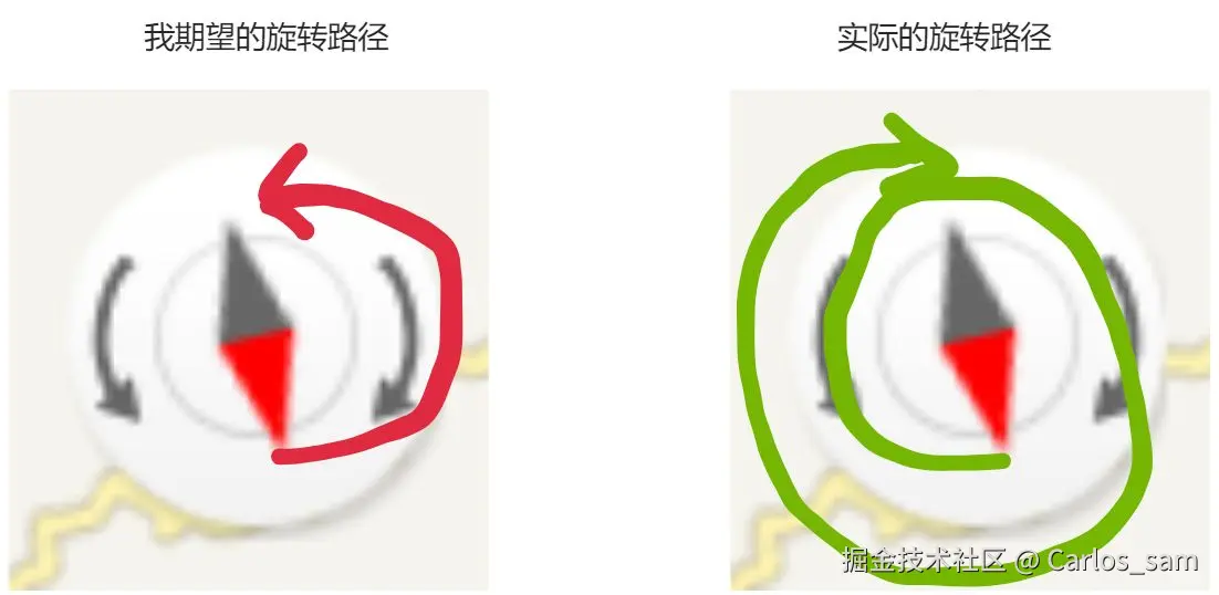 又比如当我拖动旋转地图到-689°,然后点击指针让旋转角度归零,可以看到此时指针转了好几圈才会到0位置,这也是不符合我的期望的,我希望指针可以按照最短的路径回归到零位置(正北反向)。