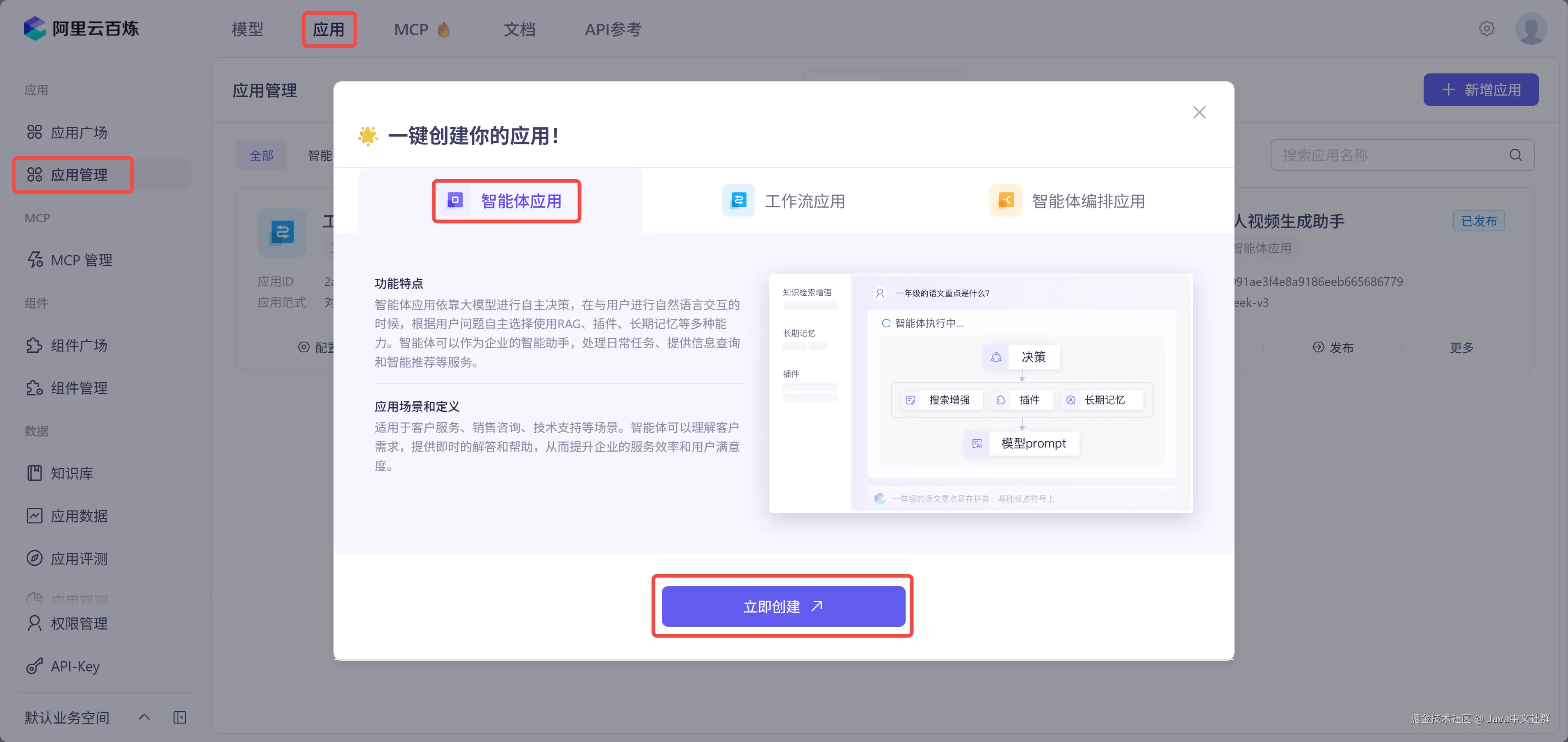 - 在百炼平台创建智能体应用。