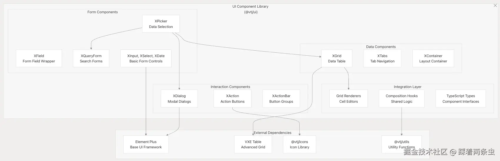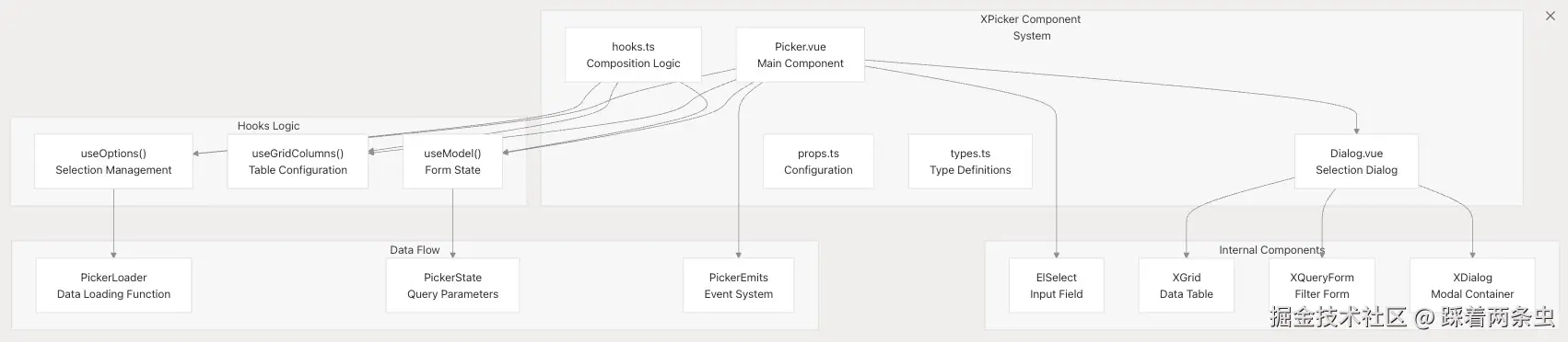 该库提供了一组丰富的表单组件,这些组件使用 VTJ 特定的功能扩展了 Element Plus。XPicker 组件通过将多个 UI 元素组合到一个复杂的数据选择界面中来举例说明这种方法。