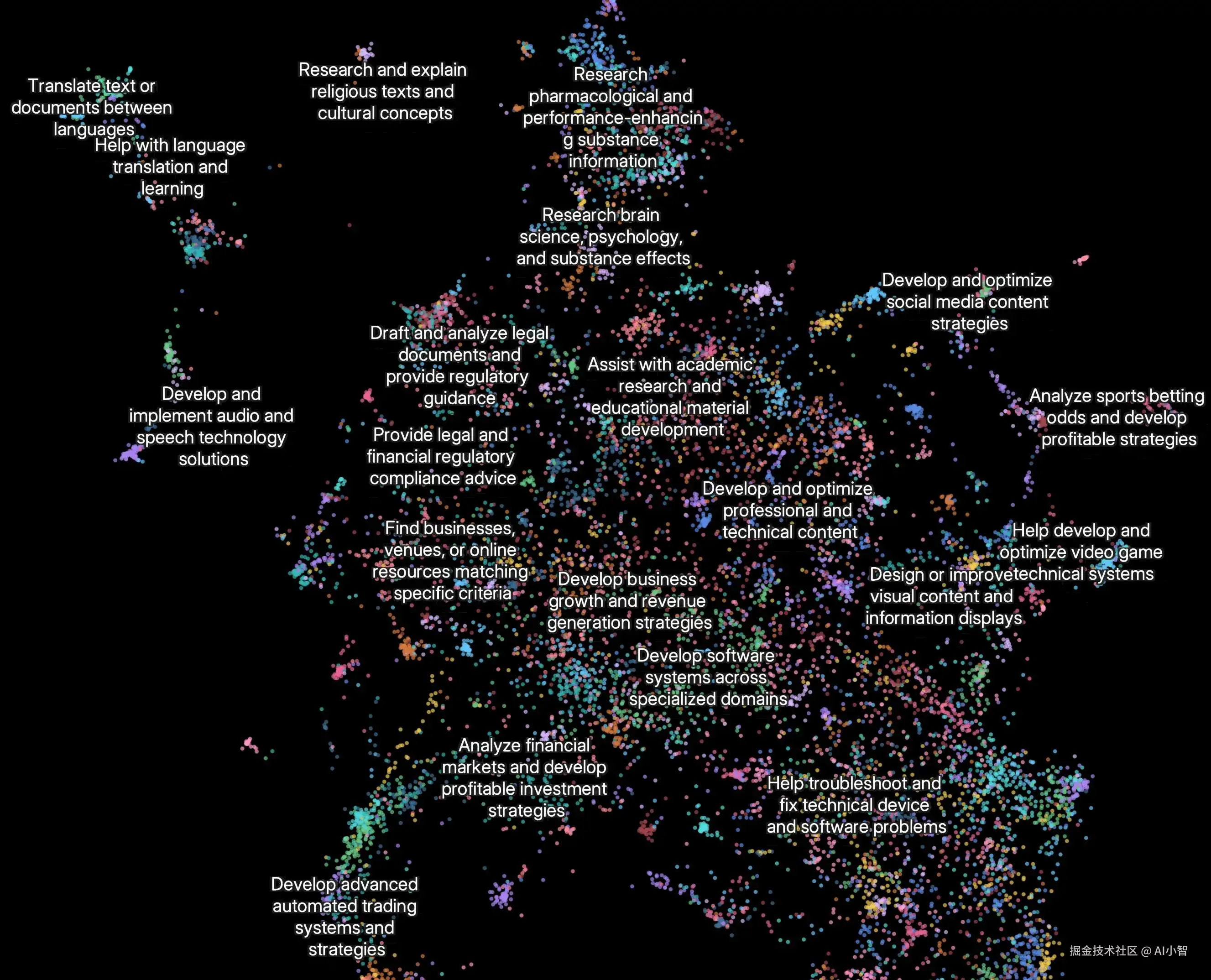 Clio 嵌入图显示,Claude Research 主要应用于软件系统开发(10%)、专业内容优化(8%)、商业增长策略(8%)、学术研究(7%)、信息核查(5%)等领域。