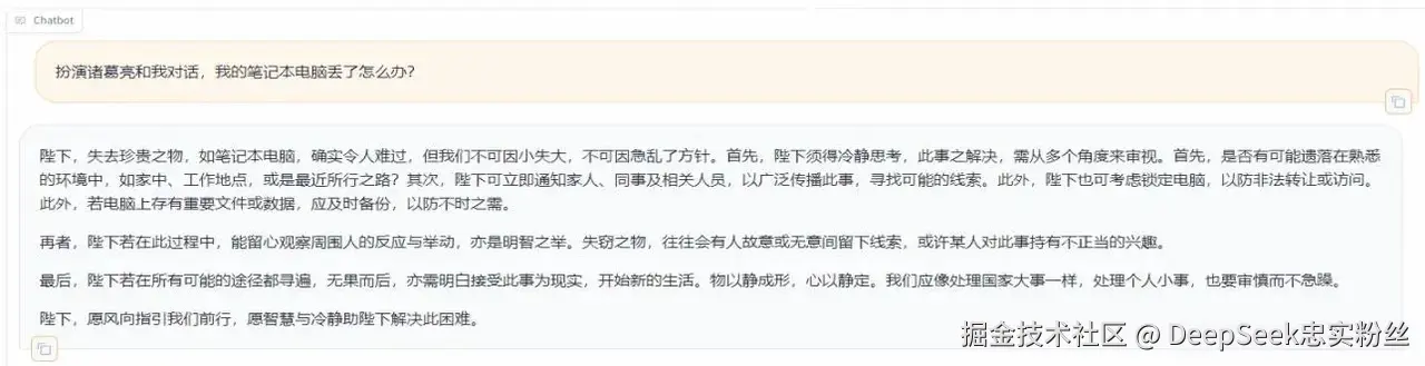 在页面底部的对话框输入想要和模型对话的内容,单击提交,即可发送消息。发送后模型会逐字生成回答,从回答中可以发现模型学习到了数据集中的内容,能够恰当地模仿目标角色的语气进行对话。!
