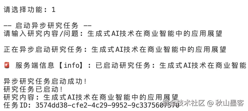 - 首先启动一个DeepResearch任务,MCP Server会立刻返回一个任务ID: