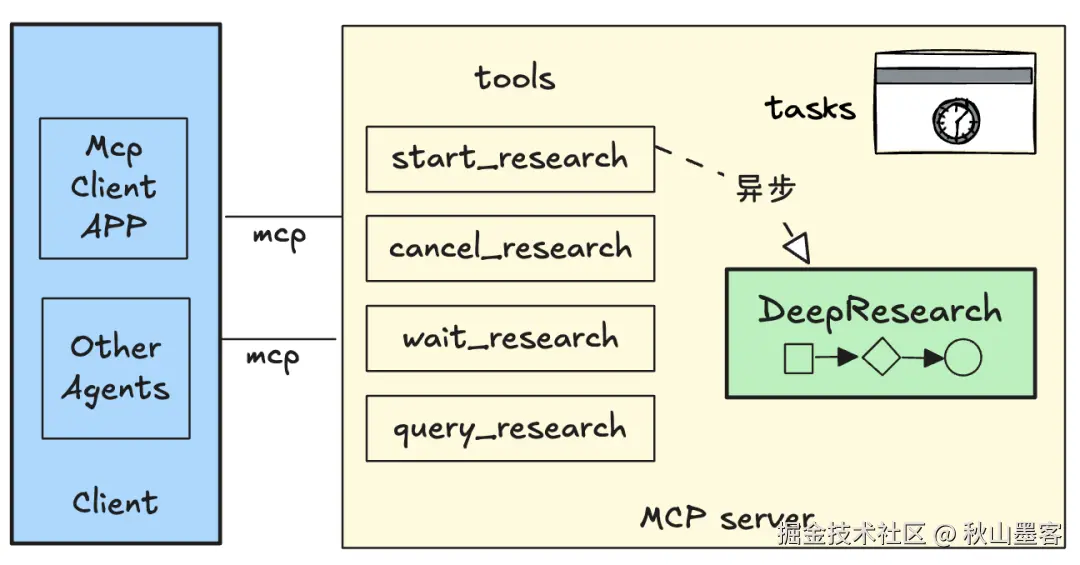 DeepResearch(深度研究)是一种颇为实用的Agent形式,如LangChain/Google,国内的字节/天工都有不错的开源项目。本文将尝试借助开源项目,构建一个可在MCP Server中异步运行的DeepResearch,并且支持任务进度推送与超时控制(源代码见文末)。