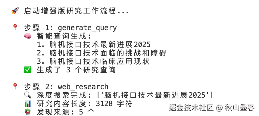 在进行下一步之间,可以对这个DeepResearch Agent做独立测试,确保其能够正常调用与输出。注意使用流式调用这个Agent,以方便跟踪与显示中间过程: