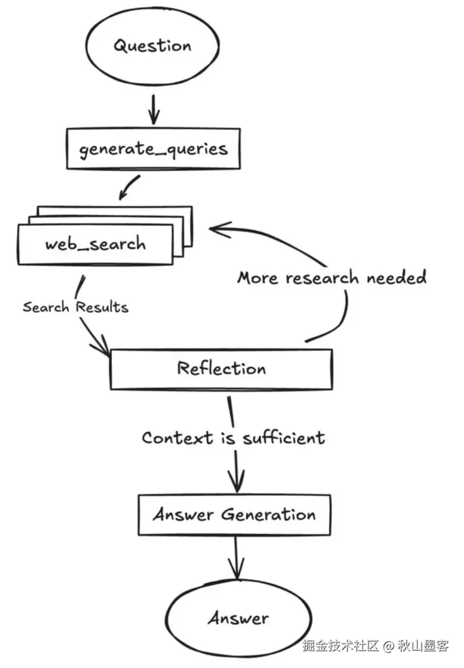 Google的这个开源项目是一个完整的端到端的简单版的DeepResearch应用,包含前端与后端。这里我们“借用”它的后端应用,这是一个LangGraph框架的Agent,其工作流设计如下:对其做如下主要修改: