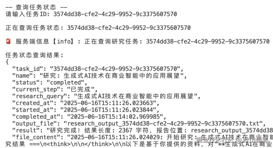 - query_research:查询某个任务的当前状态与结果,该工具会立刻返回