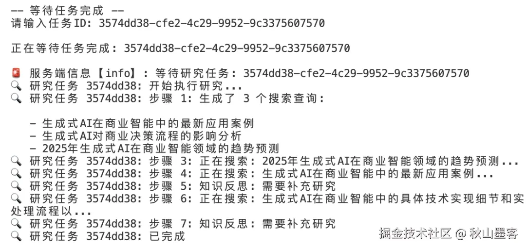 - 使用这个任务ID,你可以观察并等待该任务的完成过程与步骤。注意,任何中断不会影响到MCP Server中任务的运行: