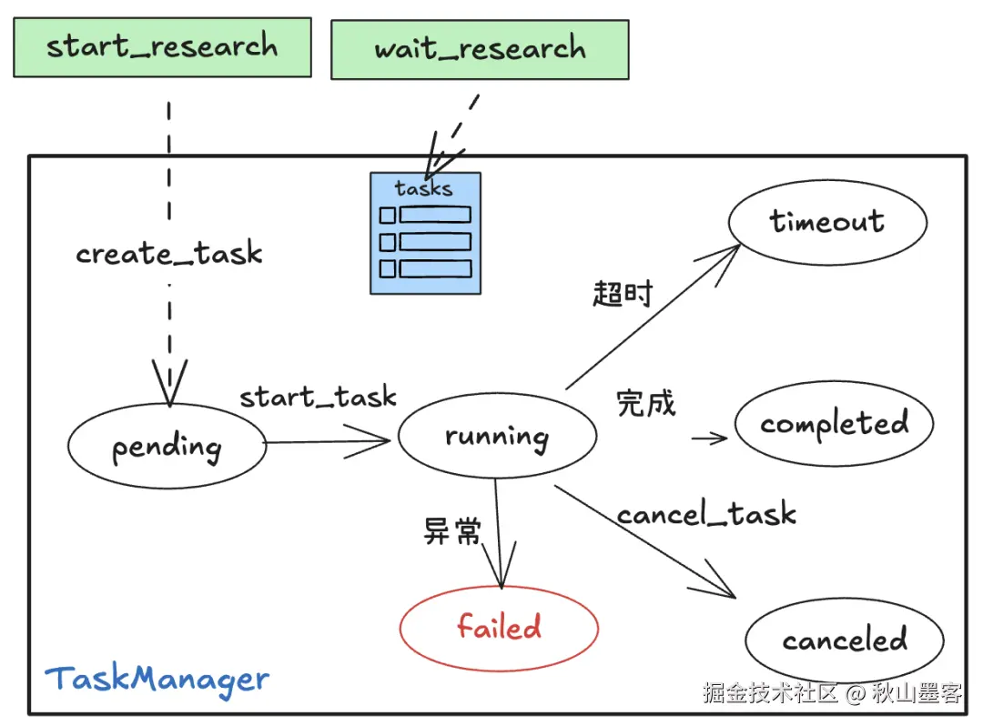 准备好Agent后,现在我们将把其“包装”成一个可以共享使用的MCP Tool。由于我们期望该任务能够异步运行,并可以随时查询任务状态与结果,因此这里构建一个MCP Server中的任务管理器(TaskManager)。其职责是:对服务端异步研究任务进行管理,包括任务创建、启动、取消与状态更新。任务变化的状态图与相关接口的关系如下:【TaskManager】任务管理器的基本定义如下: