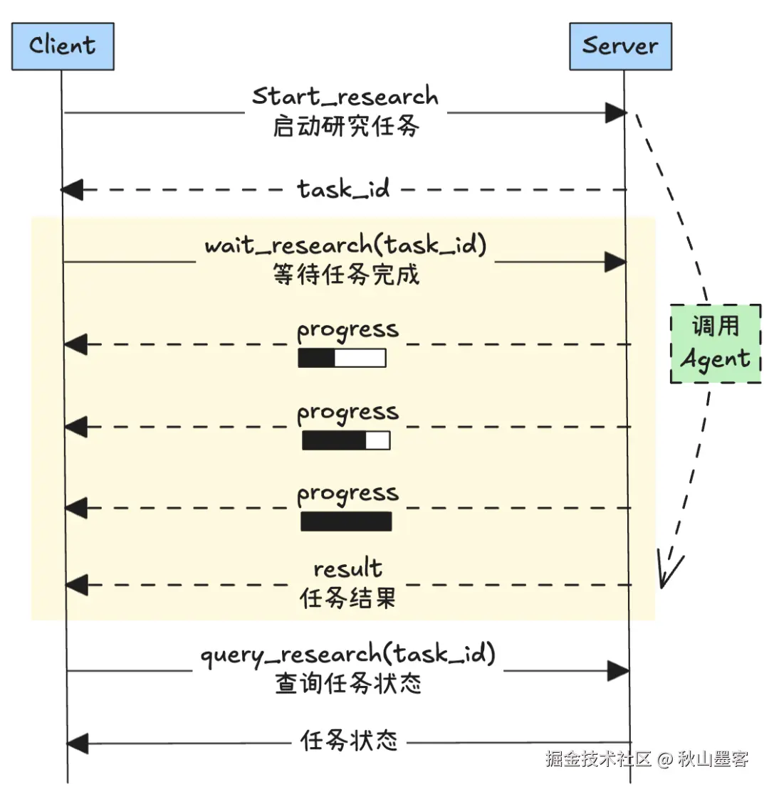 - wait_research:等待并接收某个任务的“流”输出,用来观察任务过程,该工具会持续到任务结束,中途中断不影响任务进行