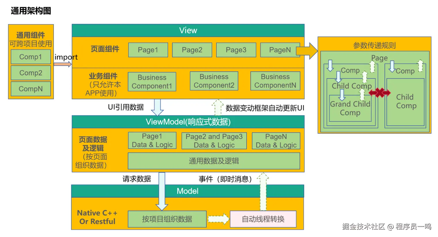很多开发者对viewModel层数据和model层数据分不清楚,这里简单做一下区分,首先model层数据,是按照整个工程、项目来组织数据,构成一套完整的APP业务数据体系;而viewModel层数据,是提供某个页面上使用的数据,它可能是整个APP的业务数据的一部分。另外ViewModel层还可以附加对应Page的辅助页面显示数据,这部分数据可能与本APP的业务完全无关,仅仅是为页面展示提供便利的辅助数据。