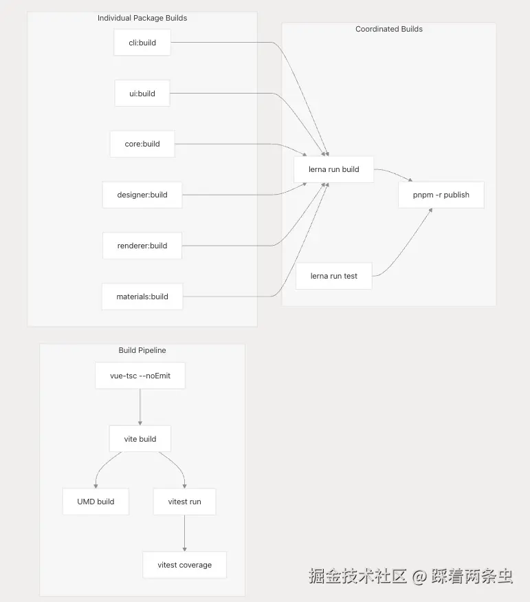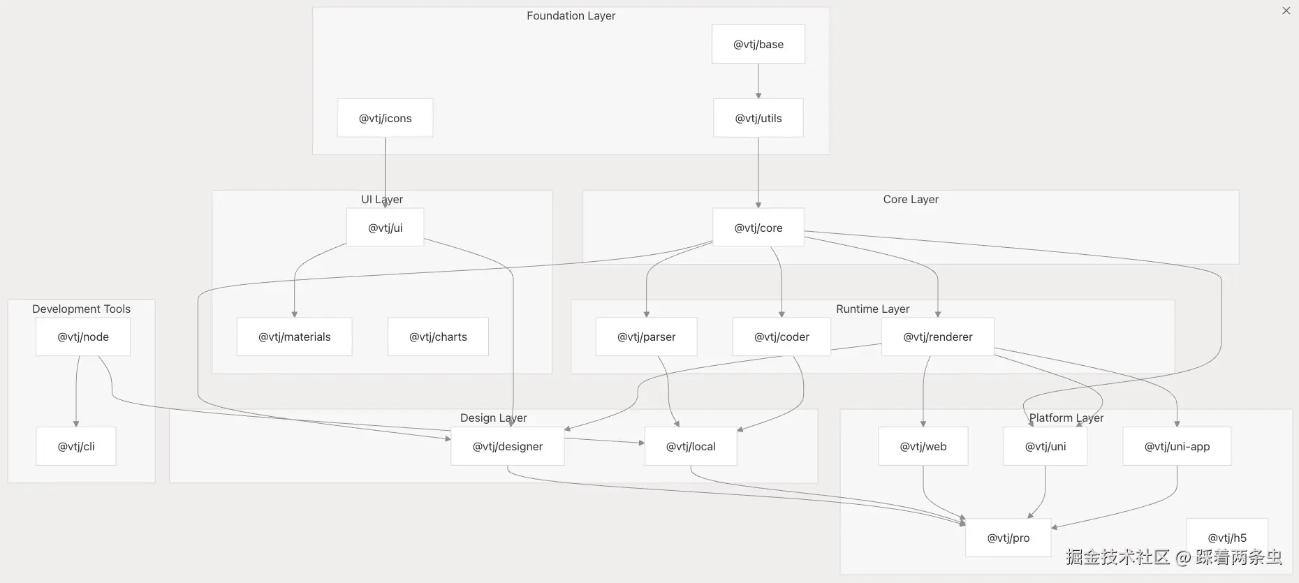 VTJ 平台使用 PNPM 工作区和 Lerna 进行包管理,以 monorepo 的形式进行组织。存储库包含组织为逻辑层的包,其工作区依赖项通过 workspace:~ 引用进行管理。monorepo 结构支持跨所有软件包的同步版本控制、共享工具和协调发布。