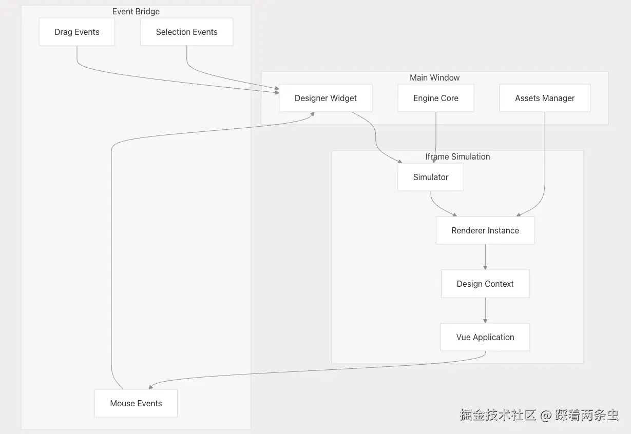 Designer 和 Renderer 系统通过基于 iframe 的共享模拟环境进行集成,该环境支持实时预览和交互。