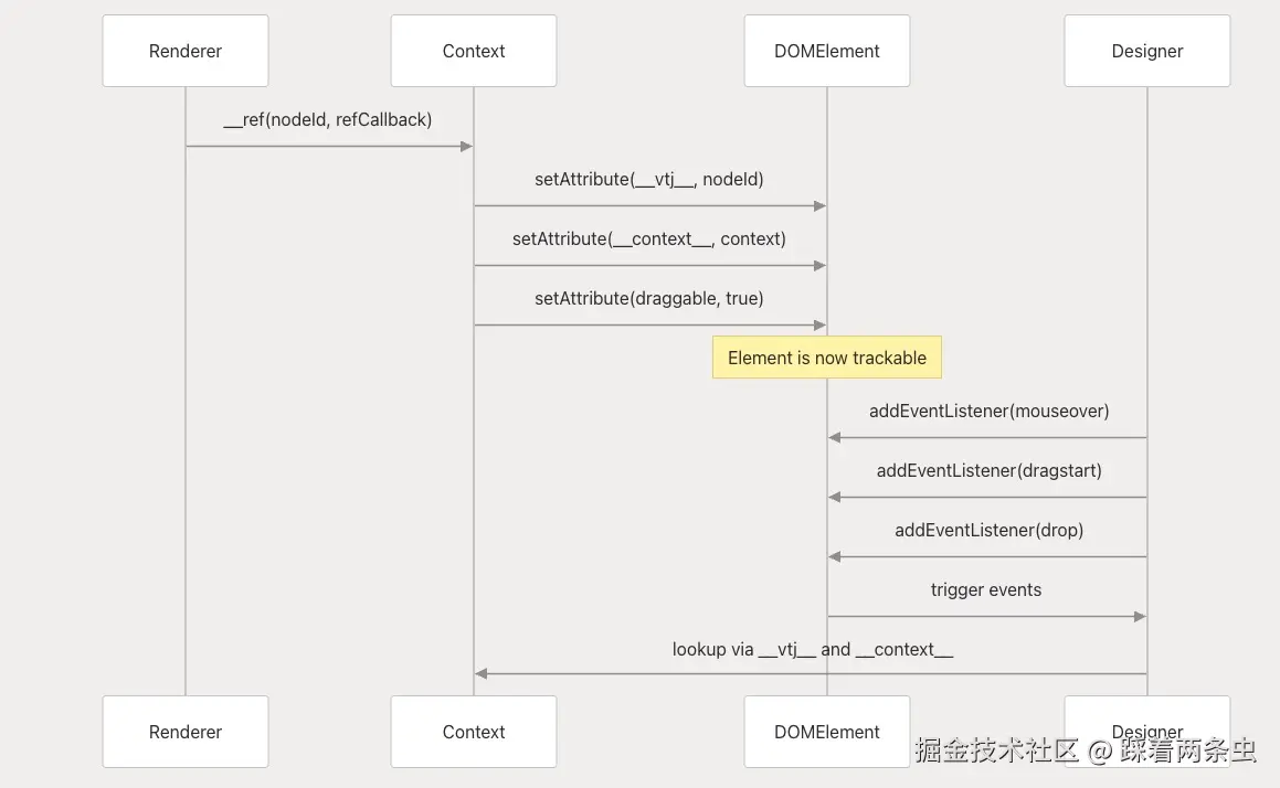 Designer 通过对具有特殊属性 (__vtj__、__context__) 的 DOM 元素进行检测来运行,这些属性使其能够在可视元素及其相应的数据模型之间进行映射。
