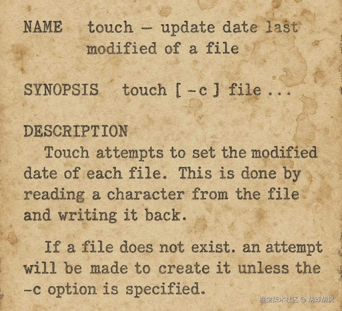 touch 命令的最初版本可以追溯到 1979 年发布的 Unix 第 7 版。那时,它还只是一个不到 100 行的小程序。在当年的手册页里,touch 命令被简洁地描述为:“update date last modified of a file”——即修改文件的最后变更时间。