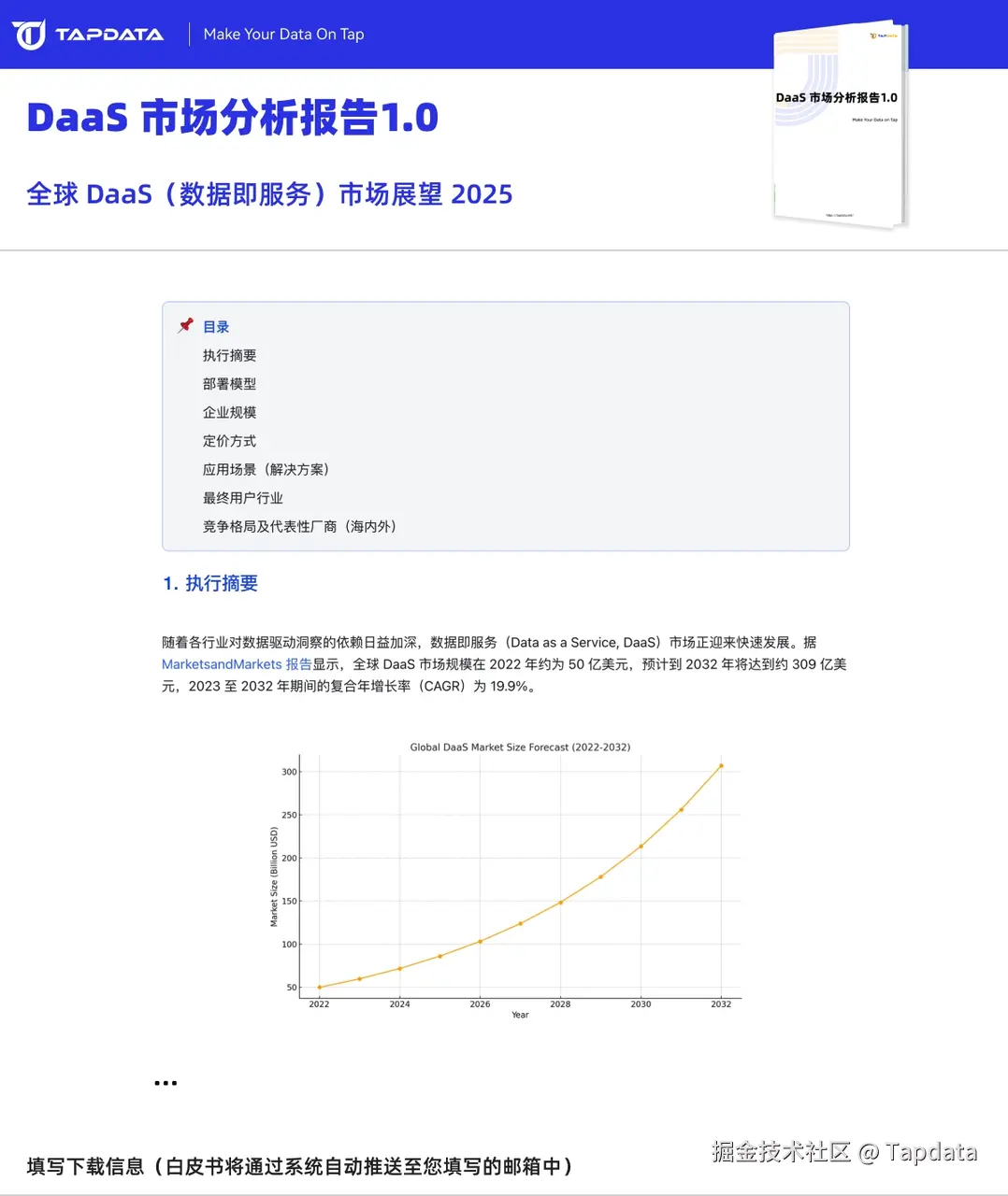 为了更好理解数据即服务(Data as a Service, DaaS)市场的发展现状与未来趋势,TapData 发布《全球 DaaS 市场研究报告 2025》,围绕市场规模、部署模型、企业应用场景、定价模式与行业格局等多个核心维度,提供系统性参考。