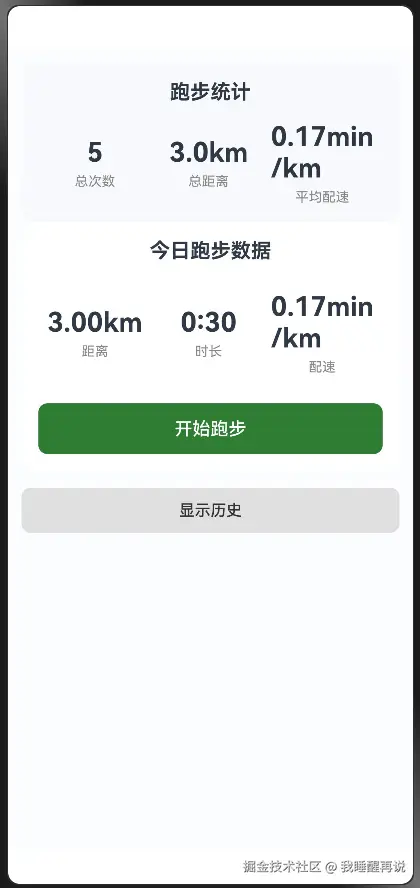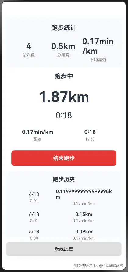 isRunning:标记跑步状态(进行中/已结束),控制界面按钮与数据展示逻辑currentDistance/duration/pace:实时跑步数据,通过定时器模拟GPS更新showHistory:控制历史记录列表的展开/收起状态