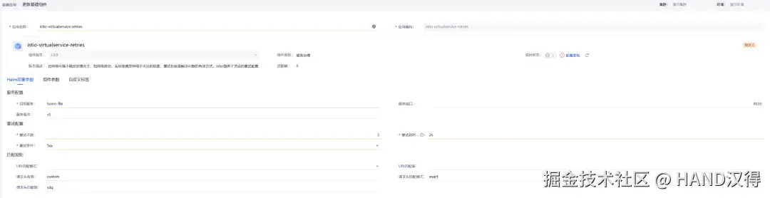 - 服务间歇性 503: 重试条件: 5xx + 重试超时时间: 1s