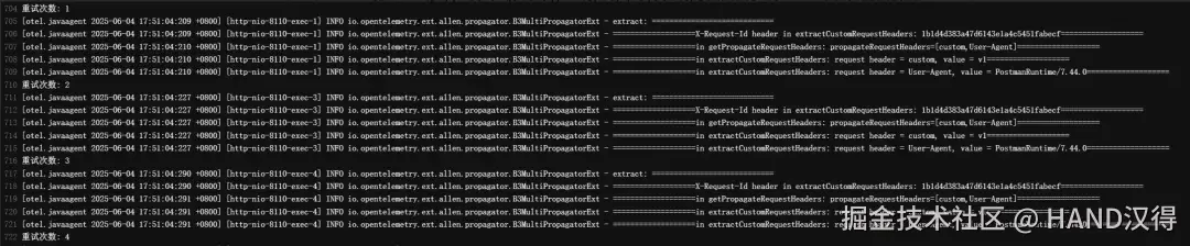观察应用日志,初始请求+重试三次,一共4次请求。