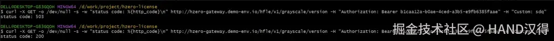 curl -X GET -o /dev/null -s -w "status code: %{http_code}\n" http://hzero-gateway.io/hfle/v1/grayscale/version -H "Authorization: Bearer b1caa12a-b0ae-4ced-a3b5-e9fb6385faae" -H "Custom: sdq1"