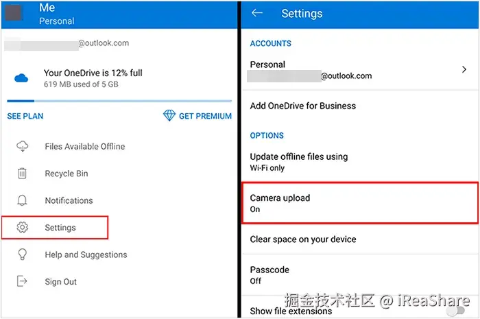 步骤3: 点击“我”图标(通常位于右下角)。然后点击“设置”>“相机上传”并将其切换为开启状态。这样,您就可以将照片上传到OneDrive进行备份。