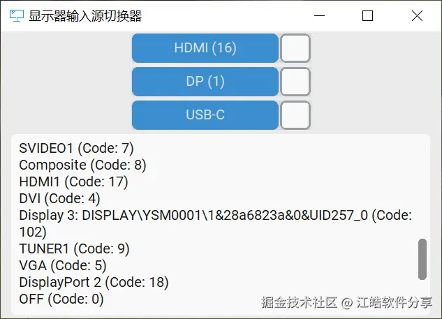 为了解决多台电脑共享一台显示器时频繁切换信号源的麻烦,我设计了一款便捷的快速切换工具。由于每次更换不同接口(如HDMI、DP、USB-C)时都需要进入显示器菜单手动调整,操作繁琐且效率低,因此这款软件应运而生。