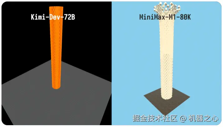 一位推特用户使用 three.js 生成拆烟囱 demo,结果显示,MiniMax-M1-80K 一把过,而 Kimi-Dev-72B 生成的代码需要使用 Claude-4-Sonnet 修复 3 个 bug 才能运行。