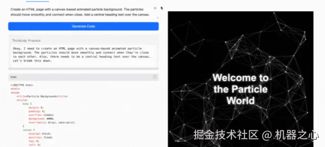 此外,MiniMax-M1 的可视化效果很强。比如输入提示词:创建具有基于画布的动画粒子背景的 HTML 页面,颗粒应平稳移动并在靠近时连接,在画布上添加中心标题文本。(Create an HTML page with a canvas-based animated particle background. The particles should move smoothly and connect when close. Add a central heading text over the canvas.)