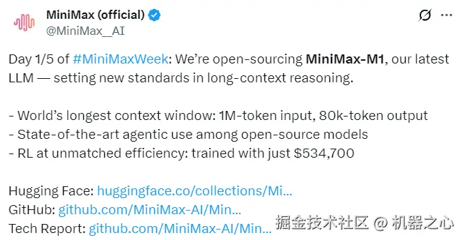 其中,MiniMax 启动了「MiniMax Week」,并在第一天开源了其最新的长上下文推理 LLM——MiniMax-M1。该模型支持全球最长的上下文窗口,包括 100 万 tokens 输入、8 万 tokens 输出。