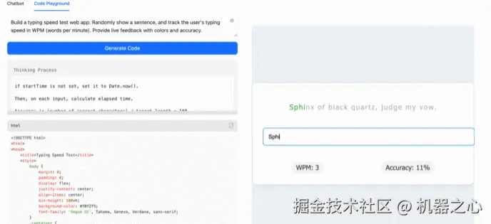 其次,MiniMax-M1 支持交互式应用程序。比如要求它构建一个打字速度测试,很快就生成一个干净、实用的 Web 应用程序,可以实时跟踪 WPM(每分钟字数)。不需要插件,也不需要设置。