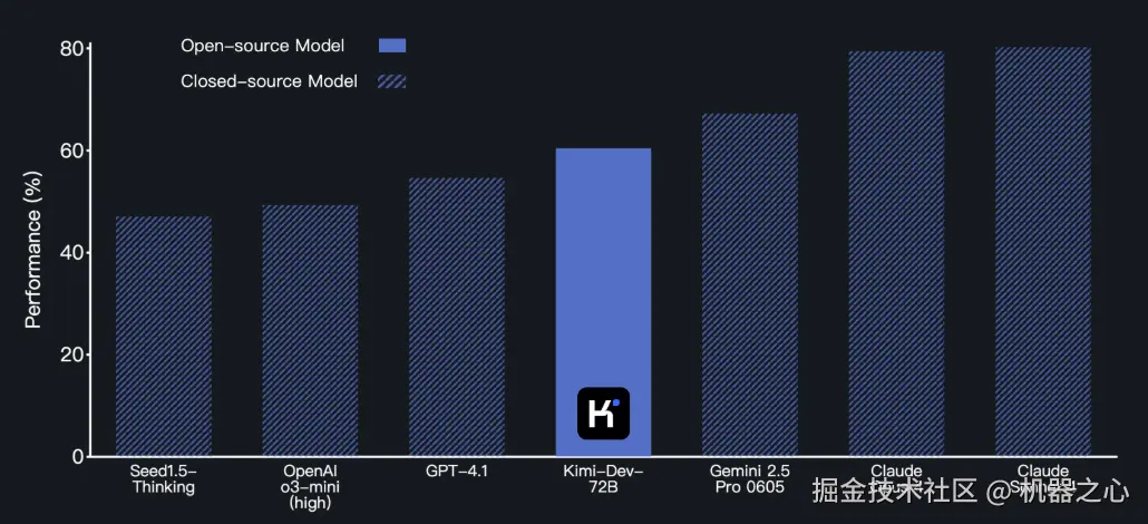 下图为 SWE-bench Verified 基准上,Kimi-Dev-72B 与闭源模型的性能比较。