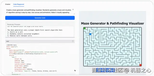 最后,MiniMax-M1 可以玩游戏。比如输入提示词:创建迷宫生成器和寻路可视化工具,随机生成一个迷宫,并可视化 A * 算法逐步解决它。使用画布和动画,使其具有视觉吸引力。(Create a maze generator and pathfinding visualizer. Randomly generate a maze and visualize A* algorithm solving it step by step. Use canvas and animations. Make it visually appealing.)