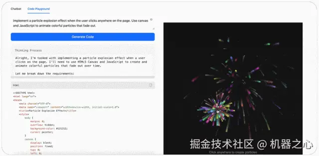 如此强大的 MiniMax-M1 有哪些亮点功能呢?首先,它支持 UI 组件聚焦(Spotlight),只需输入提示词,立即就可以构建一个具有基于画布的动画粒子背景的 HTML 页面。