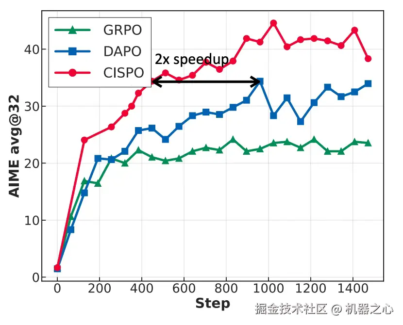- 提出了一种名为 CISPO 的新颖算法,该算法通过裁剪重要性采样权重而非 token 更新来优化模型。 在 AIME 的实验中,研究团队发现这比包括字节近期提出的 DAPO 等强化学习算法收敛性能快了一倍,显著的优于 DeepSeek 早期使用的 GRPO。