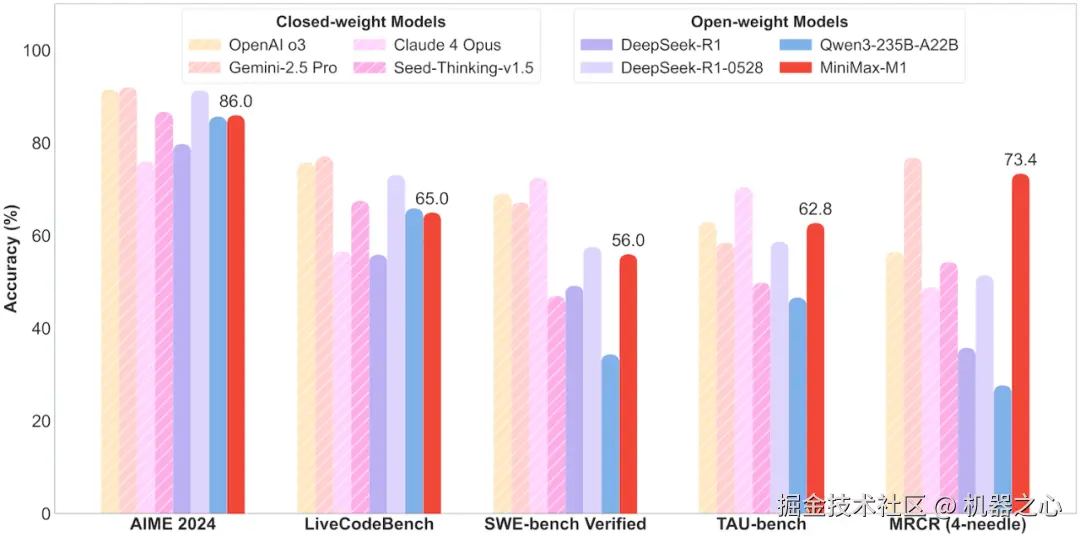 在代理工具使用场景(TAU-bench)中,MiniMax-M1-40k 同样领跑所有开源权重模型,并战胜 Gemini-2.5 Pro。