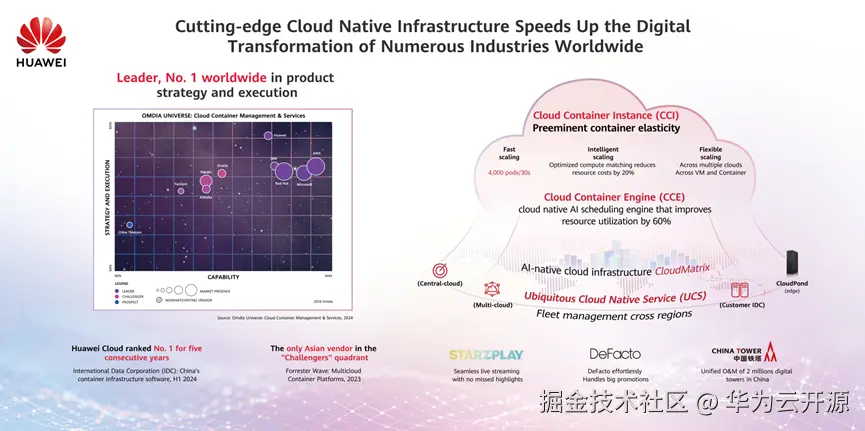 作为云原生与 AI 领域的先驱者,华为云凭借多年来的产业实践和技术创新,连续8次蝉联中国容器软件市场份额第一,Omdia 评价产品战略与执行全球第一,打造业界领先的云原生解决方案,为企业数智化转型提供强大动力。