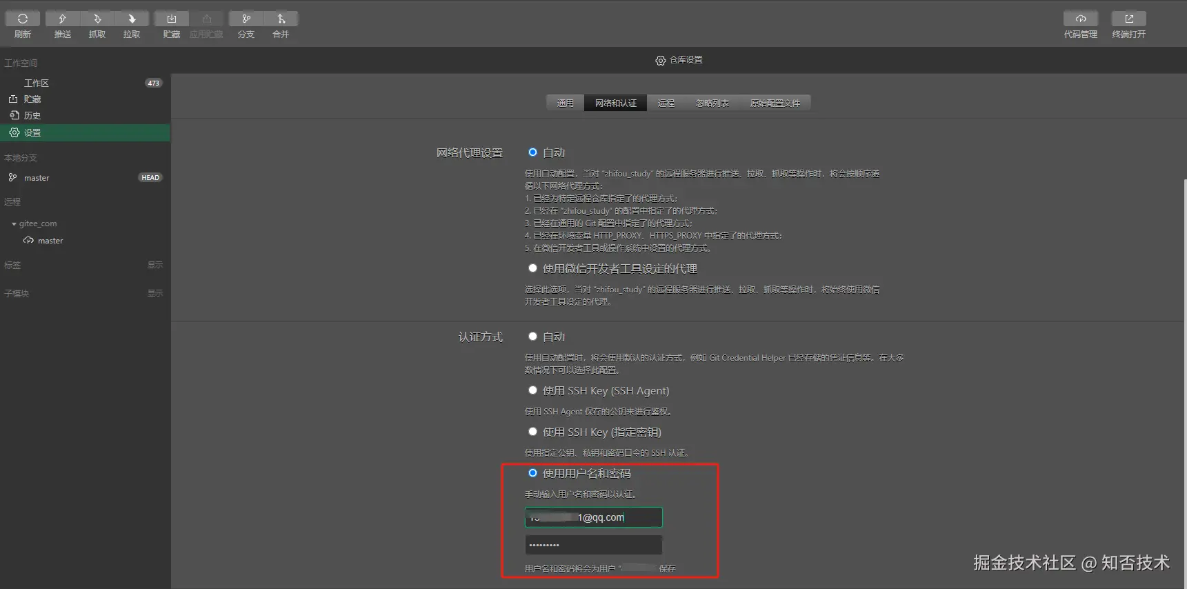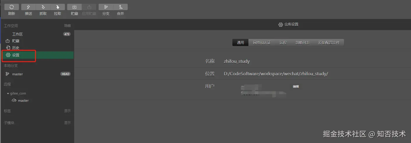 在微信开发者工具中点击版本管理,接下来需要设置通用、网络和认证、远程的参数。