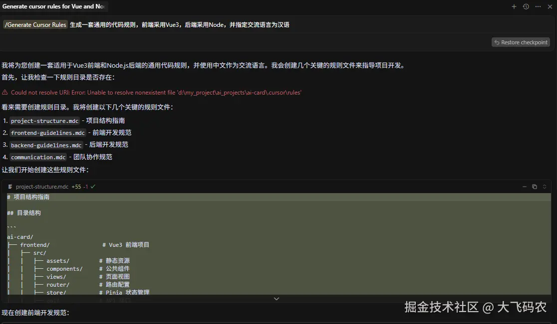 我们在本地新建一个ai-card的文件夹,然后使用cursor打开后,重点来了,制定开发规则,我们输入“/”后选择“Generate Cursor Rules”,输入你想制定的规则,Cursor会自动帮你生成。