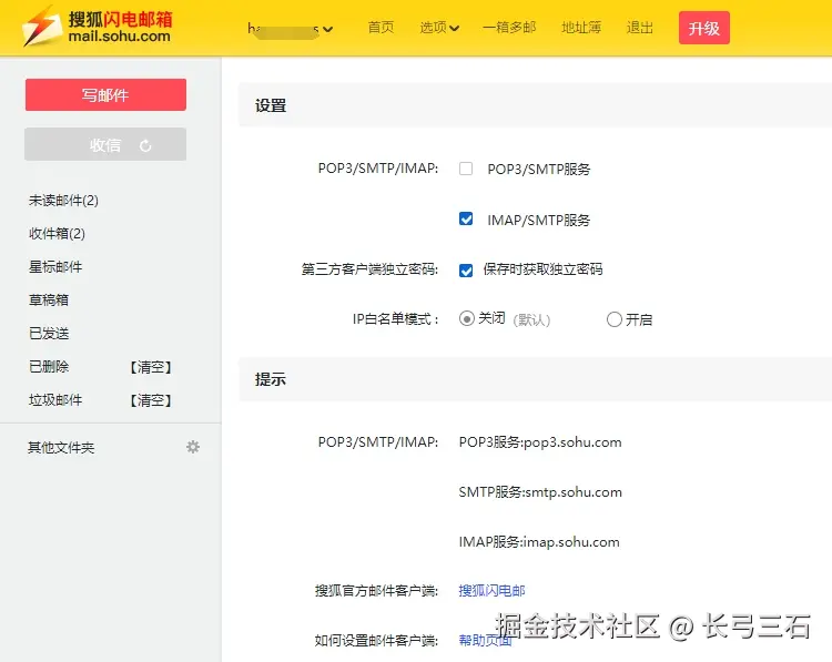 在本系列的第4篇文章《鸿蒙网络编程系列4-实现SMTP邮件发送客户端》中,基于ArkTS语言在API9环境下使用TCPSocket对象演示了SMTP客户端的实现,并且通过腾讯邮件服务器执行了实际的邮件发送。不过,在2024年末,腾讯发了一个通知,从2024年11月20日开始,停用以明文非加密方式登录的第三方邮件客户端,必需启用SSL/TLS加密方式。不过,除了腾讯邮件发送服务器,还有很多其他邮件服务器支持使用明文登录,其中比较知名的有搜狐邮箱,可以通过如下的方式启用: