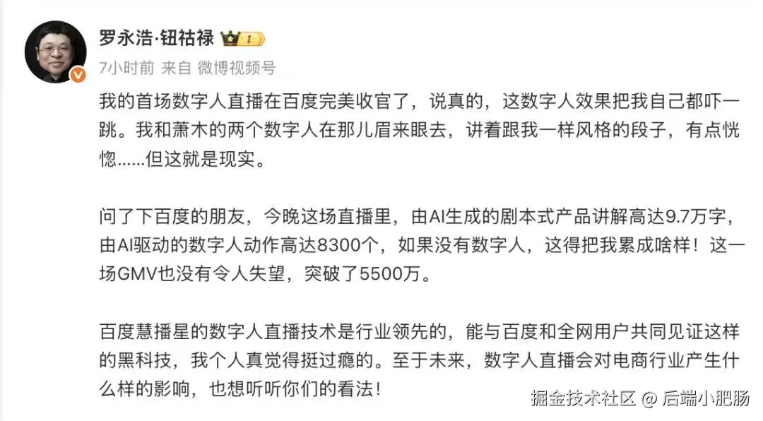 前几页罗永浩数字人在百度电商的直播首秀创下GMV超5500万的行业新纪录。
