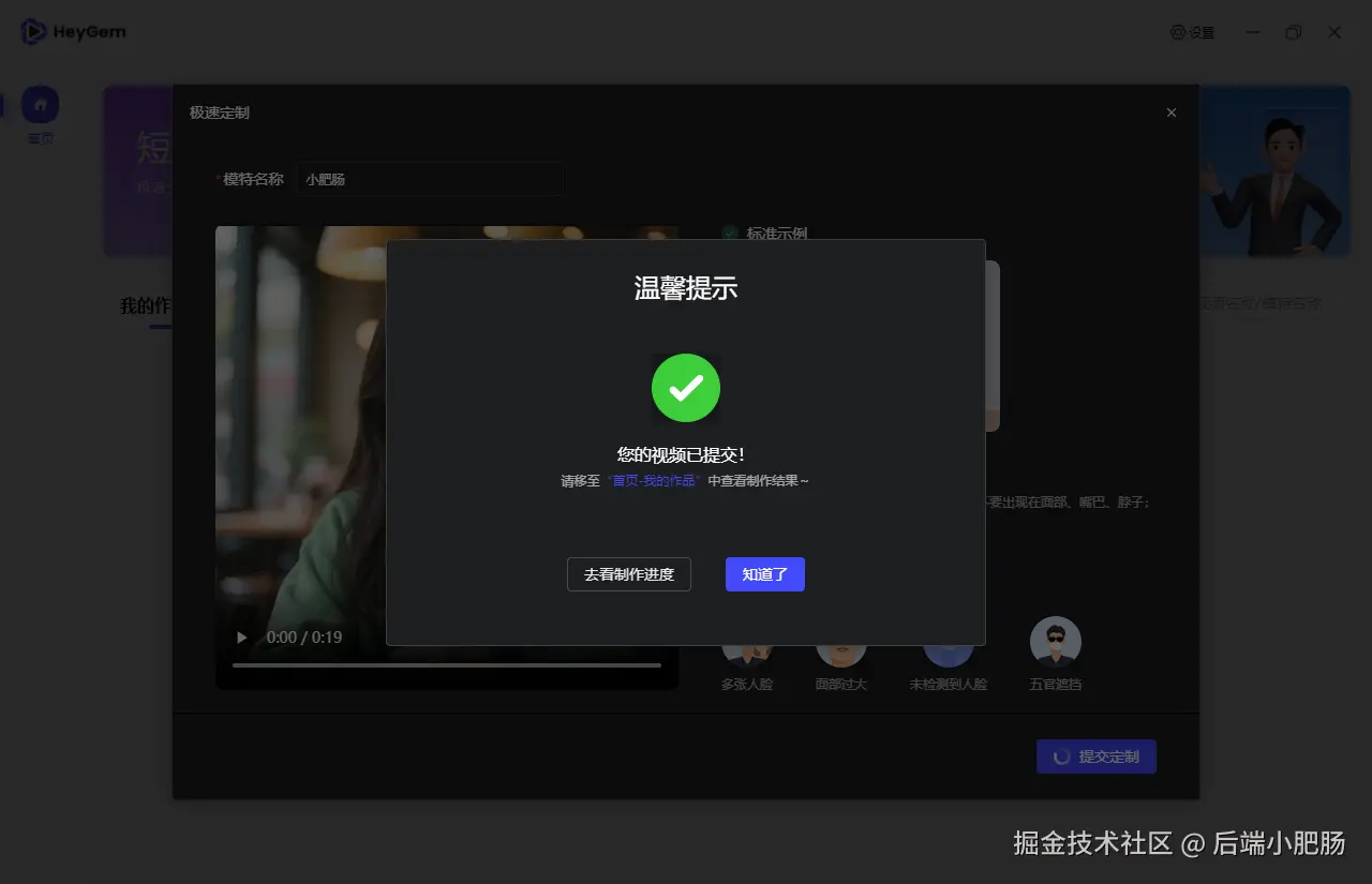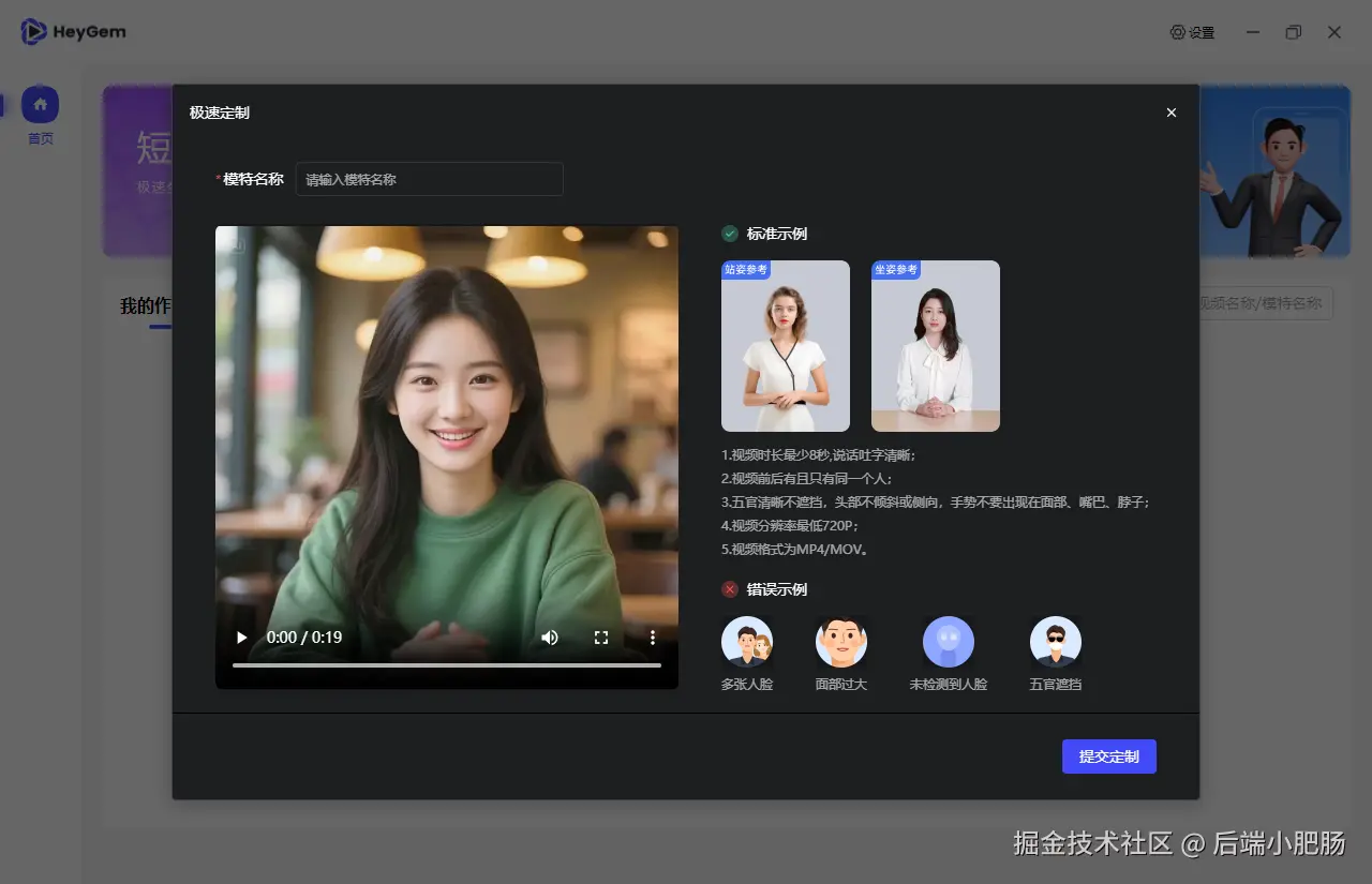 HeyGem安装完成后,就可以开始定制我们的专属数字人了,点击快速定制,上传数字人视频。数字人的制作我之前的文章教过大家基于自己的自拍照来制作数字人Coze智能体实战:3分钟构建专属数字人!公众号文章一键转为数字人口播视频(附喂饭级教程),跳转到第2章。