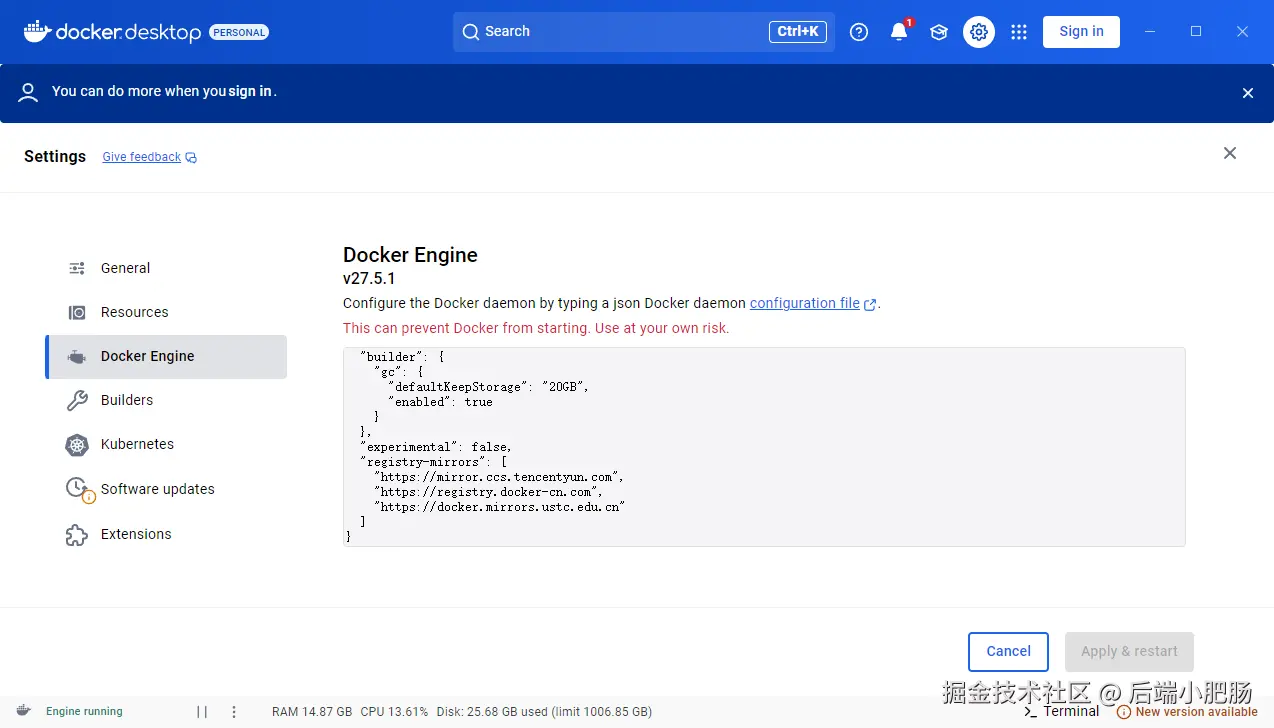 如果遇到镜像拉取不下来,就换一下Docker的镜像源,点击【Settings】按钮来到设置界面,再点击【Docker Engine】,把registry-mirrors中的镜像源换成下图内容: