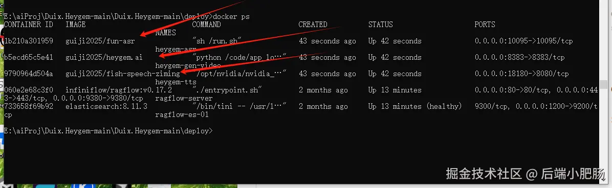 安装完以后运行docker ps命令,可以看到,我的容器已经在运行了,注意要看到三个容器才是安装成功了,分别是heygem-asr、 heygem-gen-video、heygem-tts, 如果容器少了就检查一下你的步骤有没有一比一复刻我的。