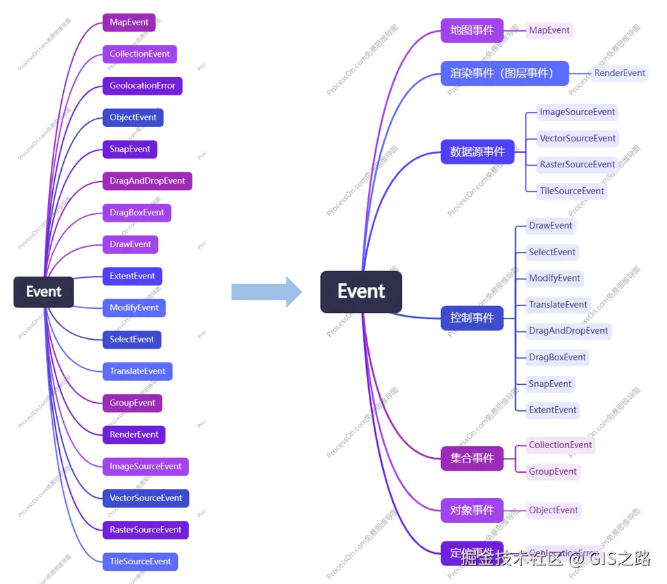 OpenLayers框架事件类型众多,我根据事件类型将其划分为地图事件、渲染事件、数据源事件、控制事件、集合事件、对象事件和定位事件,如下图所示。其中常用的事件包括地图事件,渲染事件和数据源事件以及控制事件。所有的事件都继承于Event类,具有target和type属性,以及preventDefault和stopPropagation方法,还包括change和error两个基本事件类型。